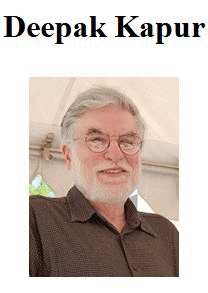 Below are some memories of Deepak from some of his friends in the US. This webpage is very much under construction, and will be updated as more friends send in their memories. Independently, a former student of Deepak's, ThanVu Nguyen, has set up a googlegroup:https://groups.google.com/g/deepak-kapur-memorial The posts to the group appear to be open-access and seem to have much more and better information about Deepak's scholarly life.